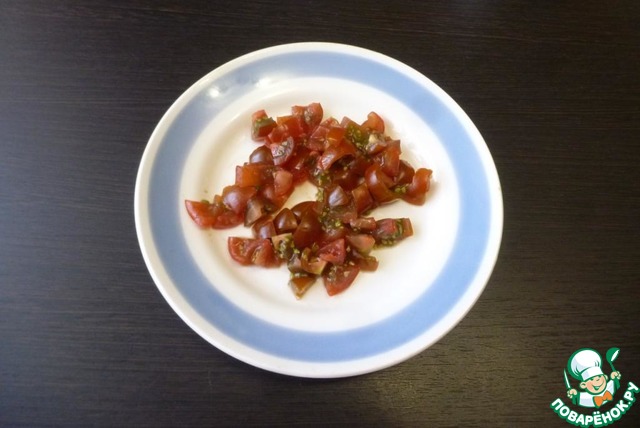 Для следующего помидоры нарезать кубиком. Я взяла черри, но можно и обычные помидоры. Если помидоры сильно водянистые, то сок нужно слить.