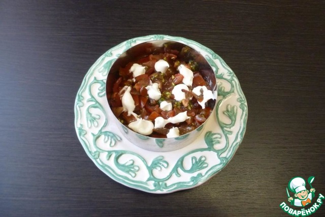 Салат можно готовить в глубокой миске слоями или выложить через сервировочное кольцо.