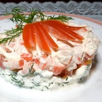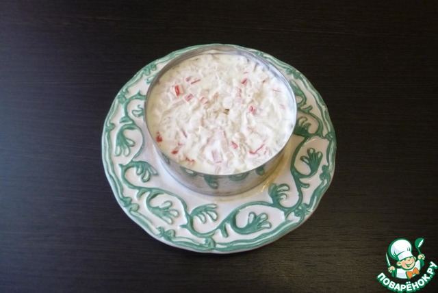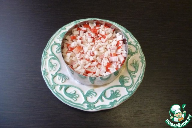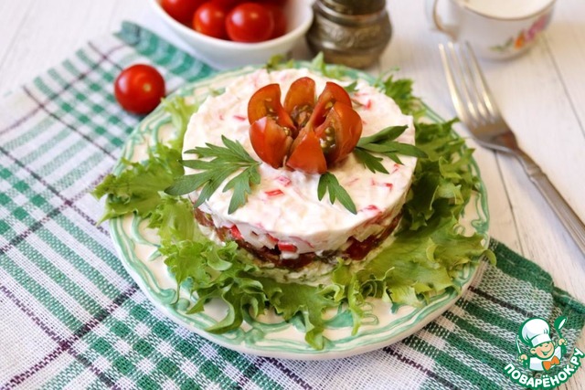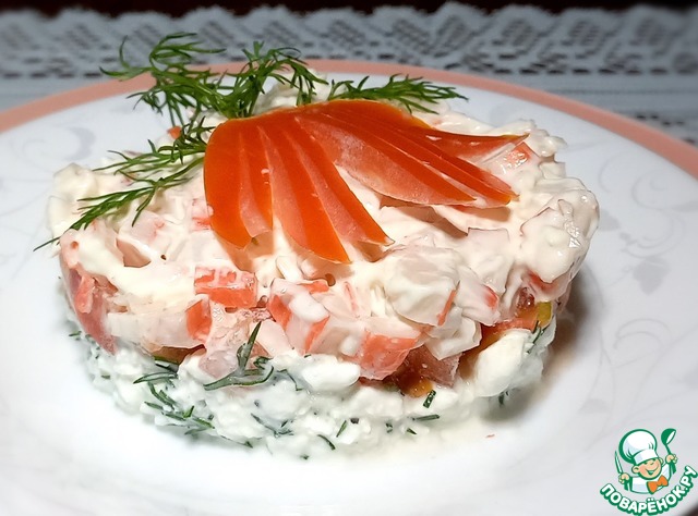 Салат готовится слоями. Слои творога, помидоров и крабовых палочек примерно одинаковые.