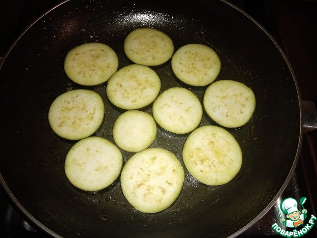 Нарезанные баклажаны присолить, обжарить с двух сторон в минимальном количестве масла на среднем огне до легкого румянца. Выложить на тарелку.