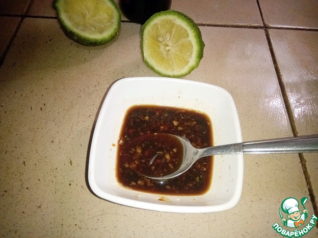 Приготовить маринад. Зубчик чеснока и жгучий перчик потолочь в ступке с щепоткой соли. Лучше всего именно потолочь, а не мелко нарезать, так все ароматы соединятся в маринаде. Хорошо смешать бальзамик, свежевыжатый лимонный сок, мед, перчик и чеснок. Если боитесь, что будет очень остро, перец добавляйте по немногу, пробуйте, или просто возьмите больше чеснока. Но в маринаде острота перца смягчится, за счёт мёда..