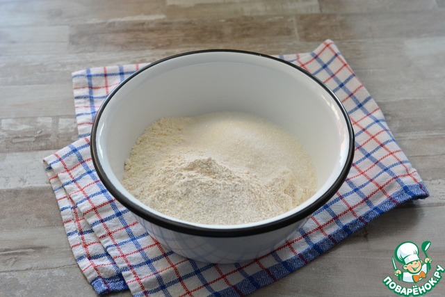 В миску просейте оба вида муки, добавьте соль, сахар, специи и соду. Соедините венчиком все сухие ингредиенты.