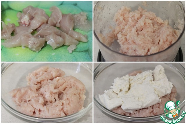 Куриное филе нарезать на куски и превратить в фарш удобным вам способом. Я воспользовалась измельчителем.