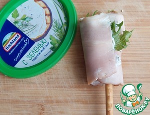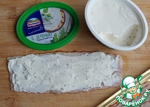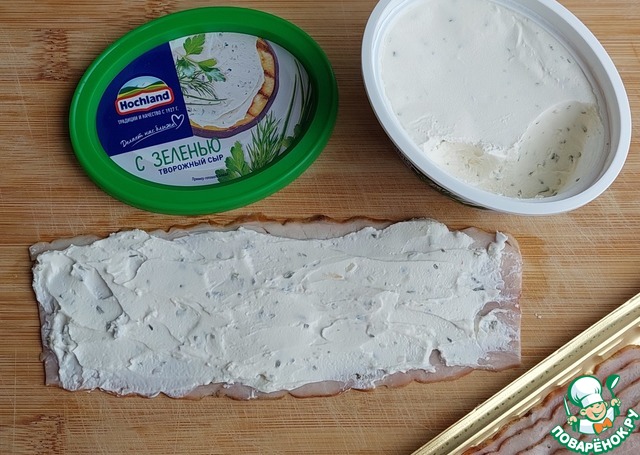 Каждый кусочек мяса смазать творожным сыром (1.5 ч. л.).