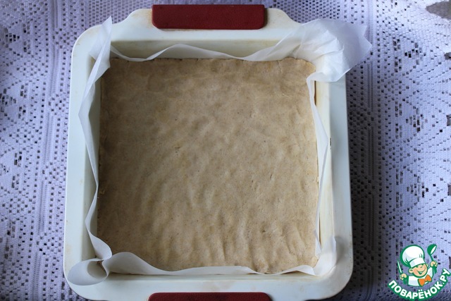Я вынимаю этот лист и раскатываю на нем тесто (с бумагой легче его потом переносить в форму) в тонкий пласт по размеру формы ≈23×23 см. Отправьте в холодильник на 30 мин.