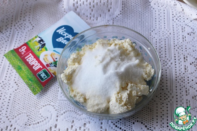 Яйца разделяем на желтки и белки, к белкам добавляем белок оставшийся при приготовлении теста. Творог с желтками и сахаром хорошо пробиваем блендером до пастообразной массы.