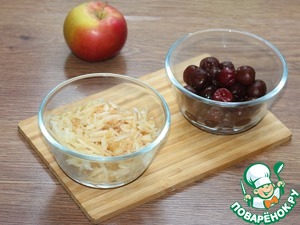 6. На творог равномерно распределить тертое яблоко и выложить рядами вишню. Если рядами, удобнее сворачивать в рулет.