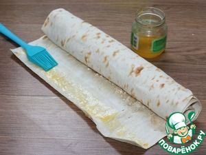 8. Противень застелить пекарской бумагой и смазать маслом (любым). Выложить рулет на пергамент. Дать ему минут 5 пропитаться. Затем смазать взбитым желтком.