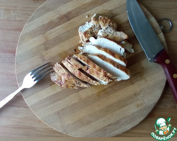 Готовое куриное филе режем. Я предпочитаю крупные кусочки.