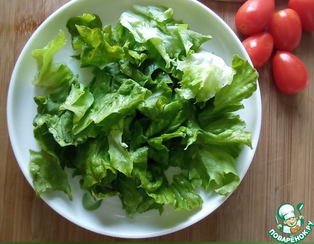 Листья салата моем, обсушиваем, рвем. Кладём на блюдо (тарелку).