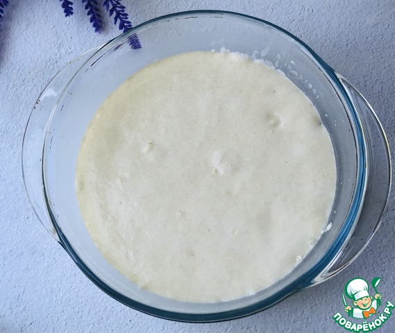 В миску наливаю теплое молоко, добавляю 1 ст. л. сахара, 3 ст. л. муки (из общего количества), дрожжи. Все перемешиваю и оставляю на 15 минут (в теплом месте) до образования шапочки.