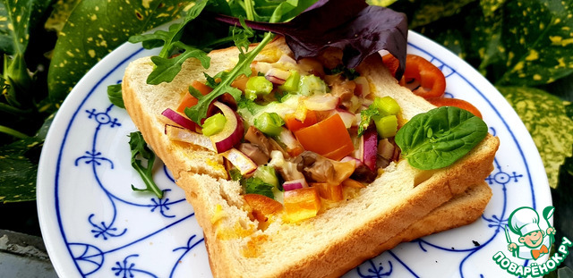 Бутерброд хорошо сочетается с простым овощным салатиком из мелко нарезанных помидоров и огурцов с майонезом. Салатик выкладывается на салатный лист на одной тарелке с бутербродом.