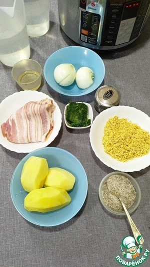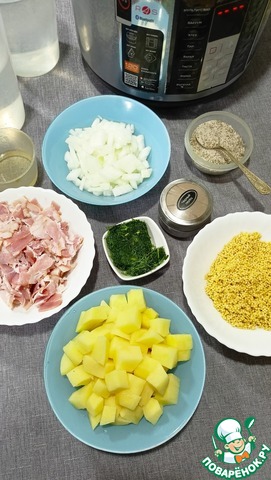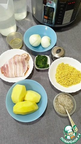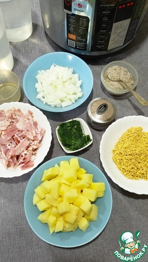 Пшено промываем теплой водой (минут 10 хотя бы). Мелко шинкуем лук с укропом. Бекон и картофель режем нужной формой (соломка / кубиками / дольками)