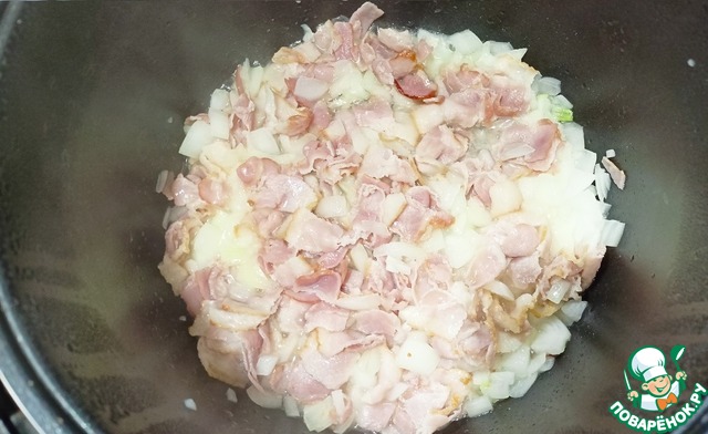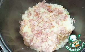 Отправляем в чашу масло плюс лук и бекон — Режим «Жарка» 12 минут