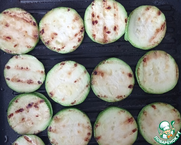 Цуккини режем кольцами толщиной 5 мм. Готовим на сковороде гриль, смазав маслом или на мангале около 5 минут.