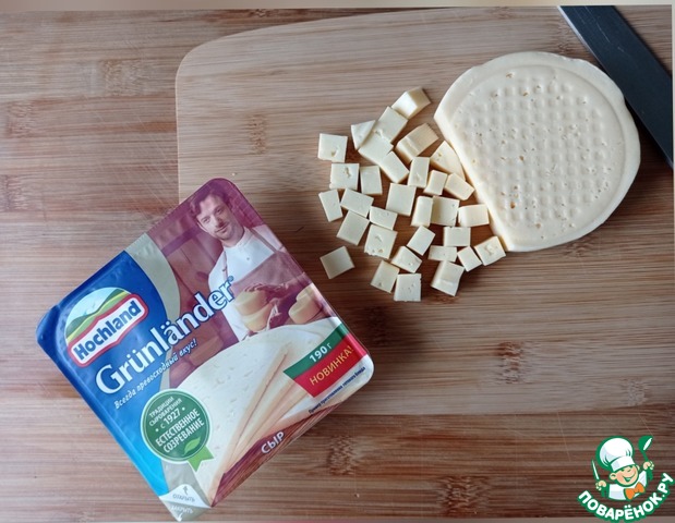 Сыр маринуем заранее. Я брала полутвёрдый Грюнландер ТМ "Hochland". Режем сыр небольшими кубиками.