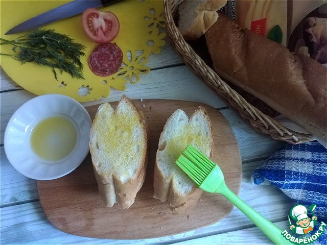 Накрываем ломтиками багета и верх смазываем оливковым маслом.