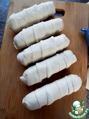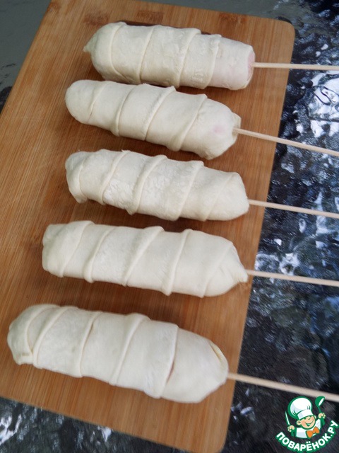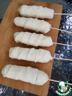Обернуть сосиску тестом, не внахлест, обязательно защипнуть края.