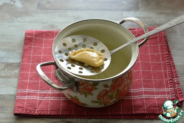 В кастрюле вскипятите воду, слегка подсолив её (примерно 2 литра воды и 1/2 ч. л. соли). Чем больше воды, тем менее клейкими будут вареники в итоге. В кипящую воду опускайте аккуратно вареники, размешайте их шумовкой, чтобы они не прилипли ко дну кастрюли. Дождитесь повторного закипания, убавьте огонь до среднего и варите примерно 3-5 минут, периодически помешивая. Выньте шумовкой на тарелку.