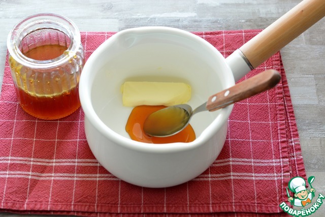 Пока плита не остыла, нагрейте в сотейнике масло с мёдом. Не нужно сильно нагревать, просто слегка "распустить" масло и перемешать его с мёдом.