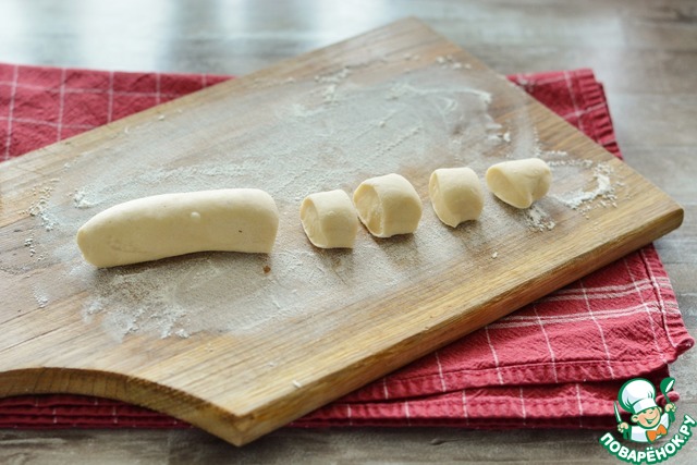 От теста отщипывайте небольшие куски, размером с пол-кулака. Раскатайте из этого кусочка колбаску диаметром примерно 2-3 см. Нарежьте её на кусочки по 2-3 см. Каждый кусочек обваляйте в муке, стряхните муку.