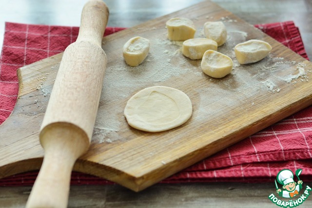 Как только первая партия вареников готова, отщипывайте от теста еще один кусок и снова: нарезали, раскатали, слепили. Такая пошаговая лепка не дает тесту подсыхать и оно лучше скрепляется.
