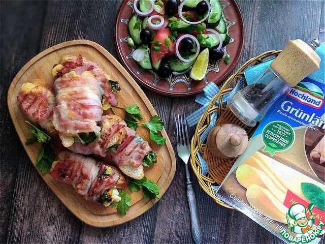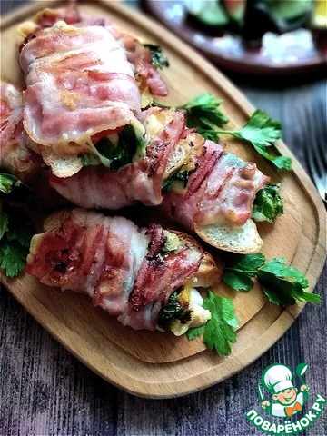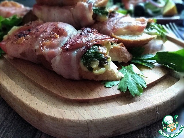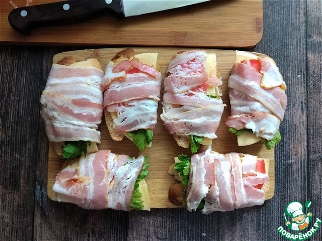 Теперь всё оборачиваем длинными полосками бекона. Если одной полоски на бутерброд не хватит, то возьмите вторую!