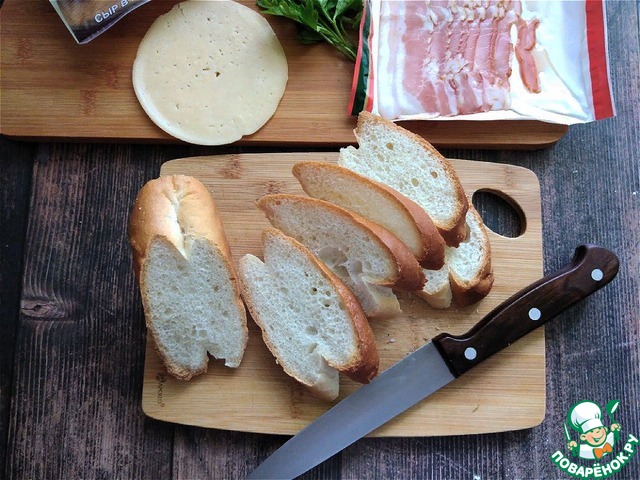 Нарезаем багет на кусочки наискосок, чтобы они были подлиней. Толщина куска ~ 2 см.