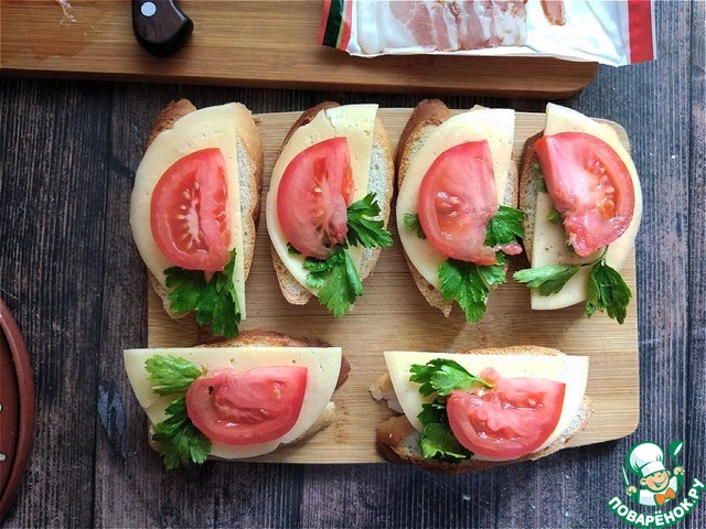 Три кусочка сыра разрезаем пополам, чтобы он поместился на кусок багета. На сыр выкладываем маленькие веточки петрушки, дольки помидора. У меня крупный был помидор и я дольки порезала ещё пополам.