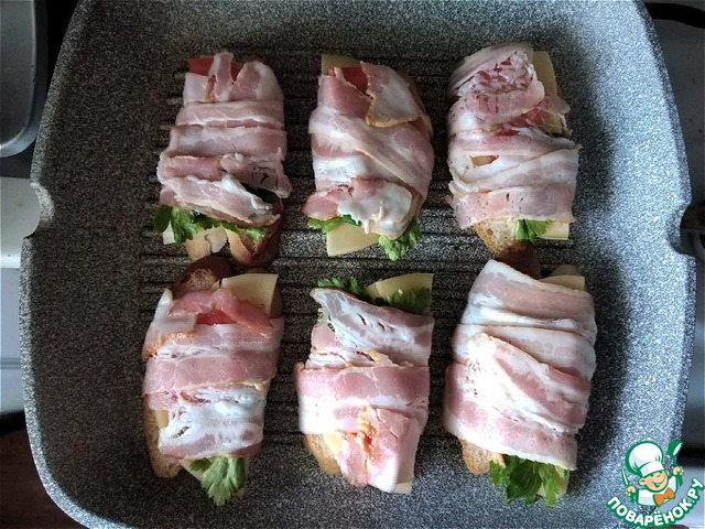 Я приготовлю бутерброды на сковороде-гриль. Обжарю с обеих сторон по 1 минуте. Долго не жарьте, бекон моментом обжаривается, да и сыр плавится.