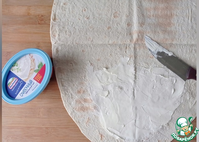 Лист лаваша смазываем посредине творожным сыром, у меня Hochland.