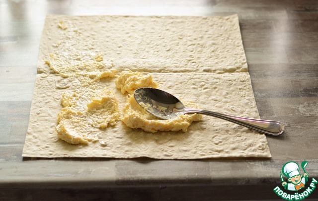 Лист лаваша расстелите на рабочей поверхности. Размажьте по всей поверхности лаваша сыр с чесноком и майонезом