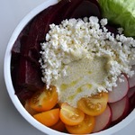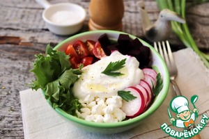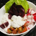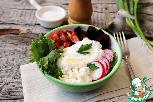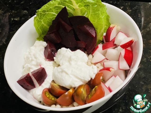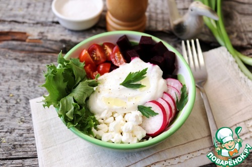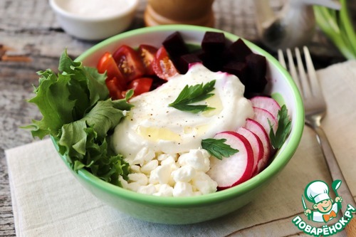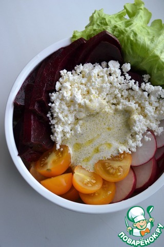 И разложив все ингредиенты сверху - запеченую свёклу, редиску, помидоры черри, листья салата и рассыпчатый творог ТМ "Искренне ваш".