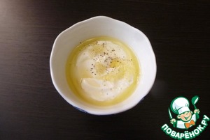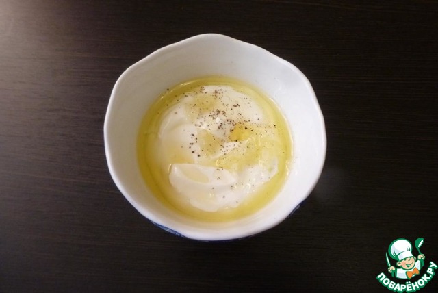 Для заправки боула смешать йогурт без добавок, оливковое масло, перец и соль по вкусу.
