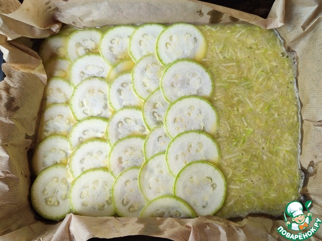 Массу вылить в форму (20×30 см.), застеленную пергаментной бумагой. Сверху выложить слой кабачков. Отправить в разогретую до 180* духовку на 30 минут. -