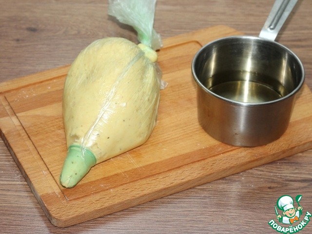 Переложить готовое тесто в "кондитерский" мешок с насадкой. В небольшом сотейнике разогреть растительное масло.
