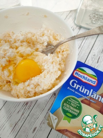 Творог пробейте погружным блендером, или перетрите через мелкое сито. Добавьте сыр и яйцо. Всё хорошо перемешайте.