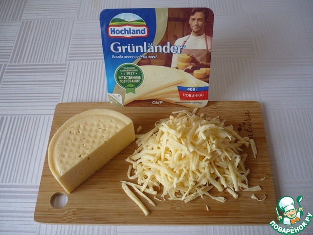 В это время для начинки на крупной терке натереть полутвердый сыр Грюнландер ТМ "Hochland".