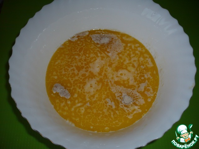 В миску влейте теплое молоко, добавьте дрожжи, сахар, соль, растопленное сливочное масло и два яичных желтка.