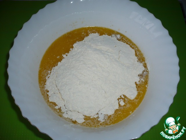 Добавить муку и замесить тесто (вымешиваем его руками около 5-7 минут, а затем собираем его в комок).