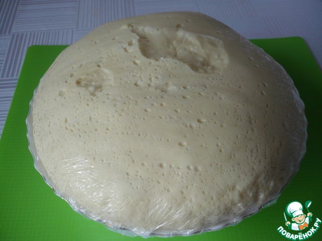 Миску смазываем растительным маслом, кладём тесто, накрываем пищевой пленкой и ставим в тёплое место на подъём.
