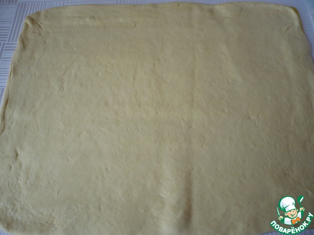 Обминаем тесто, перекладываем на стол присыпанный мукой и раскатываем в большой пласт.