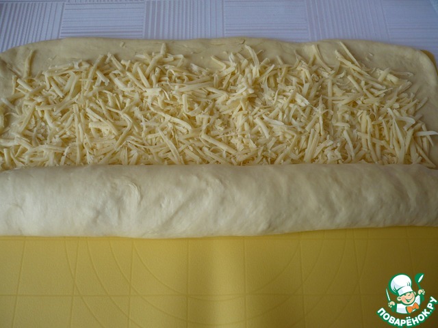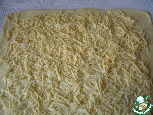 Пласт теста посыпать натертым сыром.