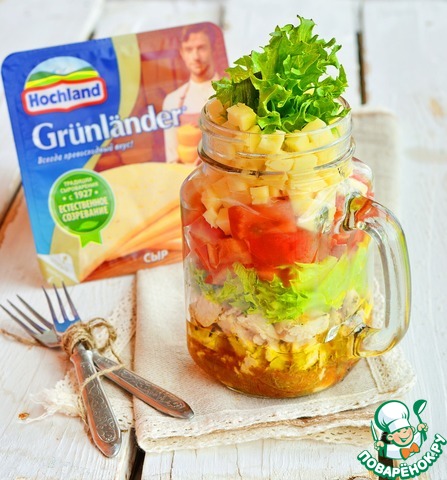 Конечно, я выложила в банку ингредиенты с "горкой" исключительно, чтобы это хорошо смотрелось в кадре. В реальности же, лучше укладывать продукты в банку до "плечиков", чтобы потом было удобно всё перемешать. Вместо банок можно складывать салат в высокие одноразовые контейнеры с крышкой.