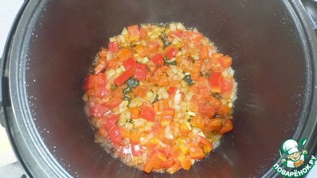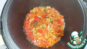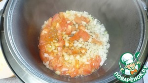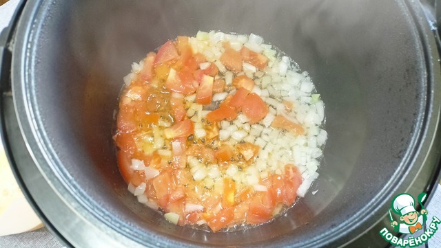 Отправляем в чашу масло, лук и томаты — Режим «Жарка» 7 минут (Не забываем перемешивать через 3-4 минуты).