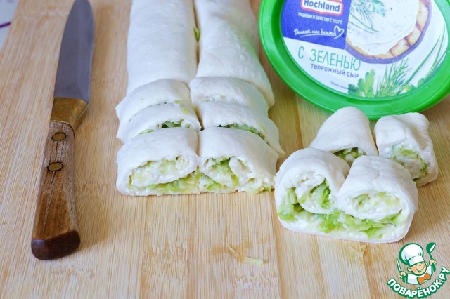 Полученный рулет острым ножом нарезаем на заготовки толщиной в 1-1,5 см. -