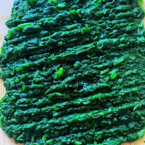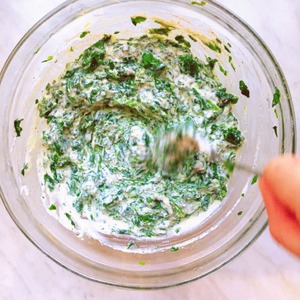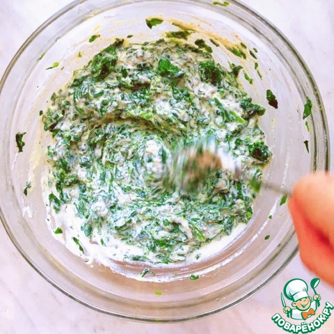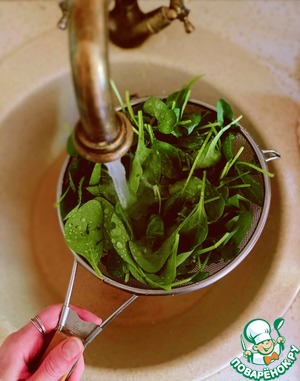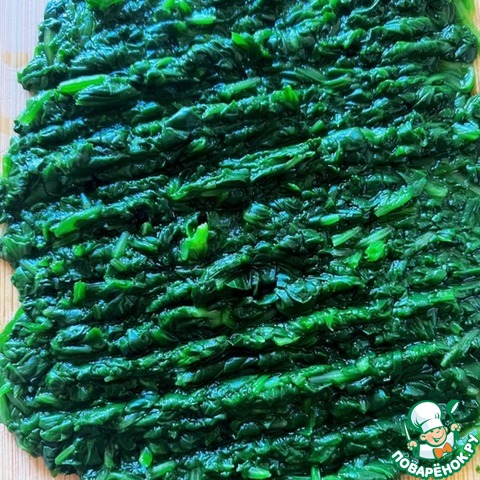 Опустите в кипящую воду на пару минут, откиньте на дуршлаг и дайте остыть. Остывший шпинат хорошо отожмите и мелко нарежьте.