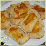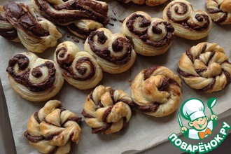 Сформировать слойки, выложить их на противень, застеленный пергаментом. Выпекать в заранее разогретой духовке при 180С, примерно 20 минут.
