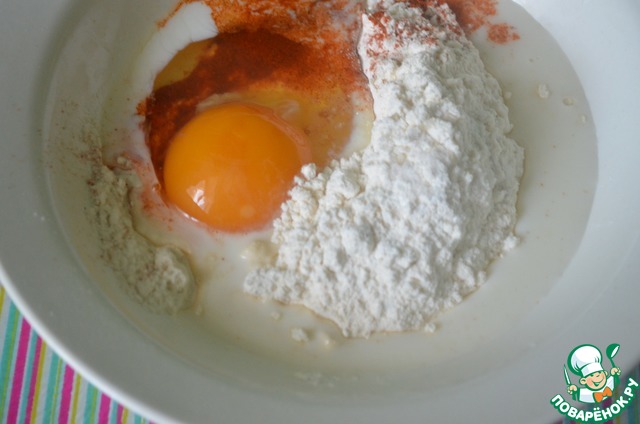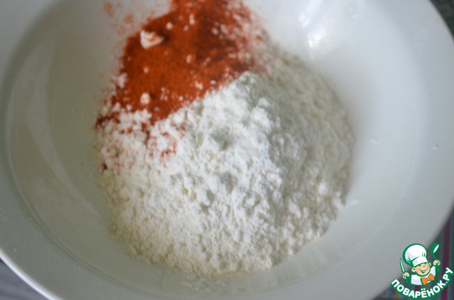 Сделать кляр. Муку, паприку, перец, соль, разрыхлитель соединить и перемешать.
