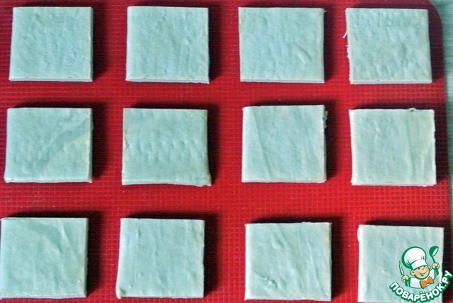 Как только тесто начнет размораживаться, разрезать на 12 прямоугольников.